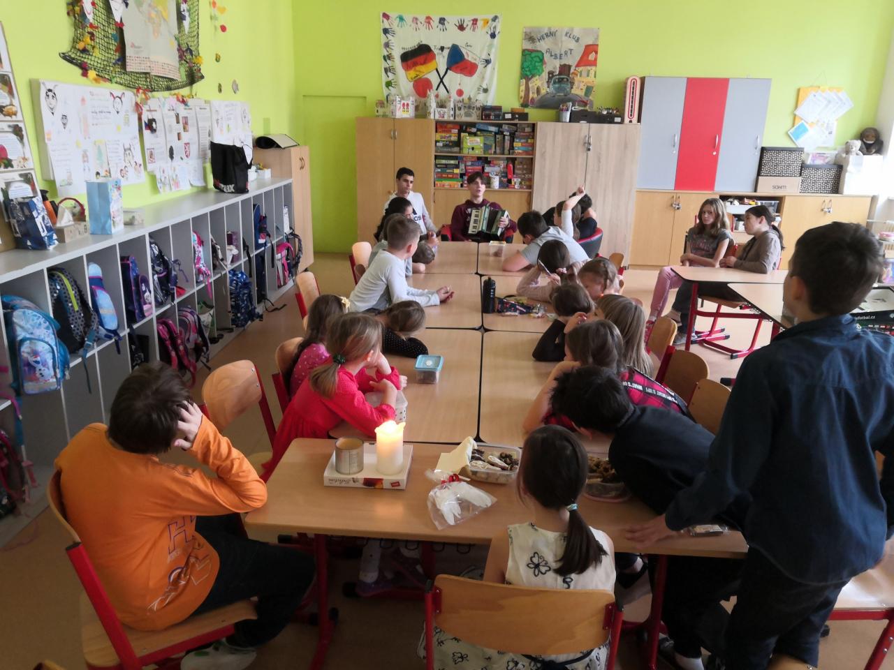 Vánoční posezení v družině, návštěva žáků z vyššího ročníku a beseda o Vánocích s hudebním vystoupením Matyho Anderleho v doprovodu Kuby Krčmáře a Péti Vojtičky se líbila.