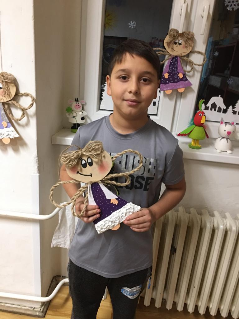 Anděl štěstí byl letošní vánoční dárek pro rodiče. Žáci si na něm vyzkoušeli nové výtvarné techniky. Pracovali s překližkou, sádrovým obvazem a jutovým lanem. Práce byla trochu náročnější, ale dílo se všem vydařilo.